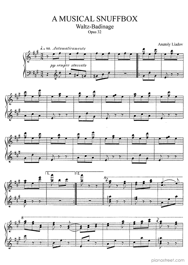 DOWNLOAD A Musical Snuff Box in A Major Op. 32 by Anatoly Liadov (published in 1893) . High quality classical piano scores from the Piano Street sheet music library.