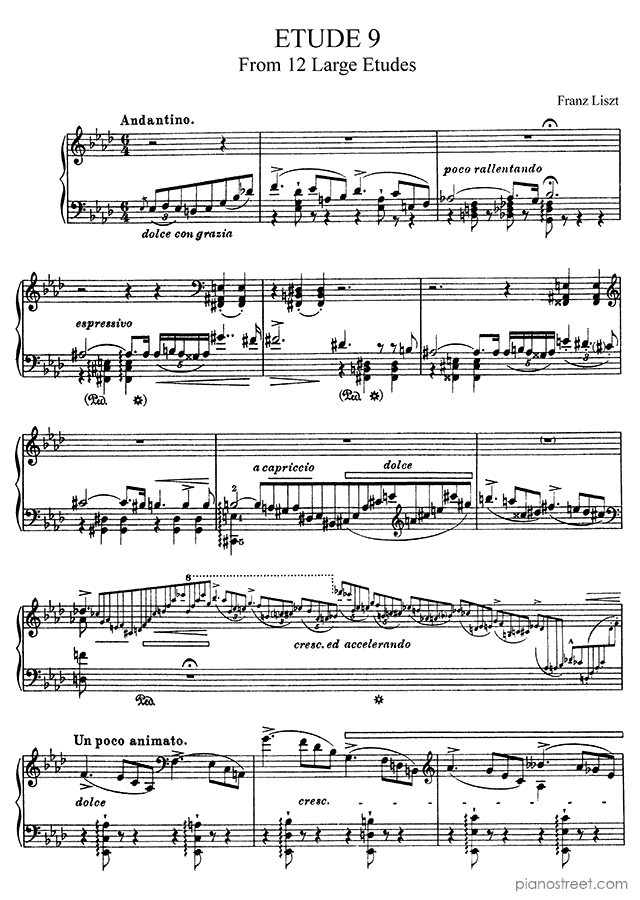 DOWNLOAD Grand Etude in A-flat Major No. 9 by Franz Liszt (published in 1837) . High quality classical piano scores from the Piano Street sheet music library.