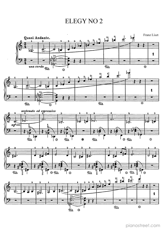 Elegy no 2 S. 197 in A-flat Major, a composition by the early romantic composer Franz Liszt. The piano score of this piece was first published in 1877 and is part of 2 Elegies by Liszt.