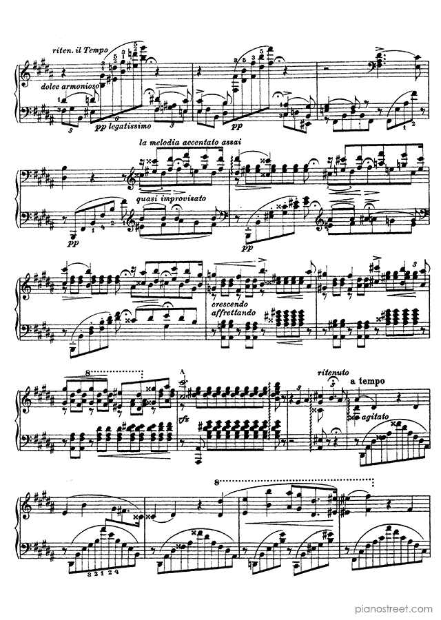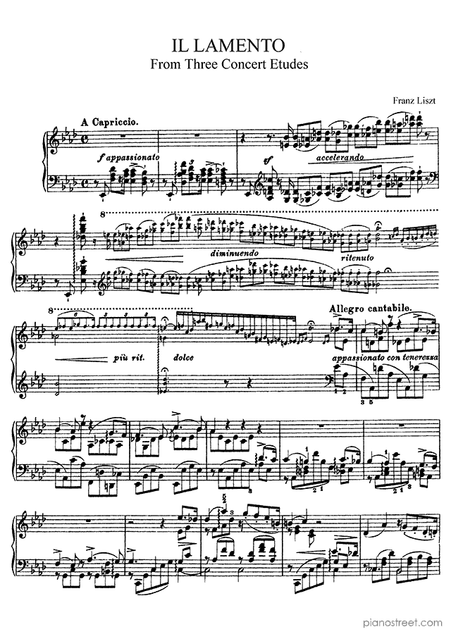 Piano sheet music and recordings. This piece is by Franz Liszt: Concert Etude - Il Lamento No. 1 in A-flat Major (published in 1848) . Level 8+, Period: Early Romantic