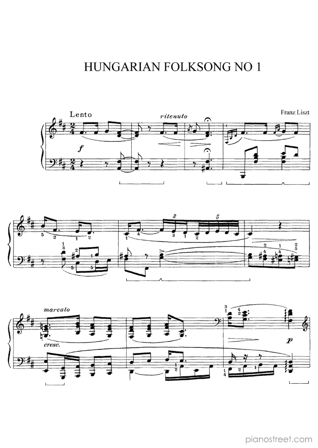 Downloadable piano sheet music from 5 Hungarian Folksongs by Franz Liszt to print: Hungarian Folksong No 1 S. 245 No. 1 in D Major (published in 1873)