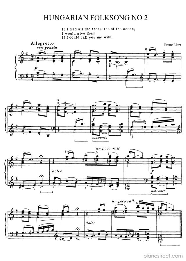 Hungarian Folksong No 2 S. 245 No. 2 in G Major, a composition by the early romantic composer Franz Liszt who was born in 1811 and died in 1886. The piano score of this piece was first published in 1873 and is part of Liszt's 5 Hungarian Folksongs.