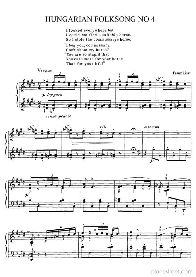 Piano sheet music and recordings. This piece is from 5 Hungarian Folksongs by Franz Liszt: Hungarian Folksong No 4 S. 245 No. 4 in C-sharp Minor (published in 1873) . Level 7, Period: Early Romantic
