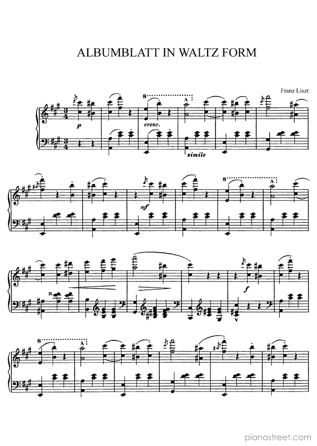 Liszt: Albumblatt in waltz form S. 166 in A Major (published in 1842) . DOWNLOAD piano sheet music from Piano Street digital sheet music library.
