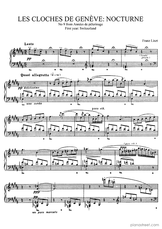 Franz Liszt: Les cloches de Genève: Nocturne - The Bells of Geneva: Nocturne No. 9 from Années de pélerinage, First Year: Switzerland - piano sheet music to print instantly. This piece is level 8+ and was composed during the Early Romantic period.