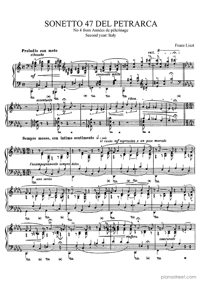 DOWNLOAD: Franz Liszt - Sonetto 47 No. 4 ( from Années de pèlerinage, Second Year: Italy by Liszt). Piano sheet music to print immediately or to view in mobile devices.