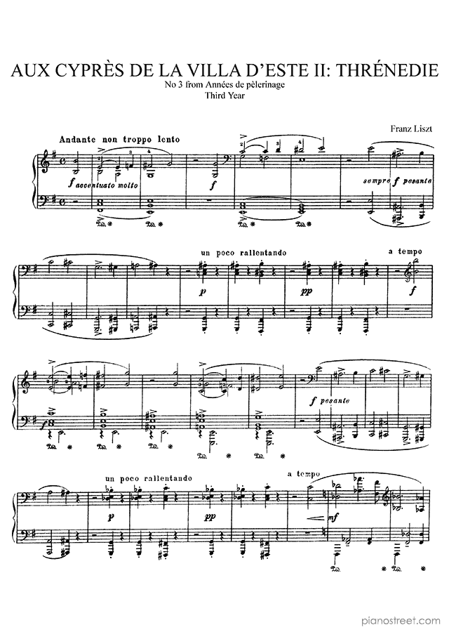 Aux cyprès de la Villa d'Este II - No. 3 is a piano piece by the early romantic composer Franz Liszt who lived between the years 1811 and 1886.