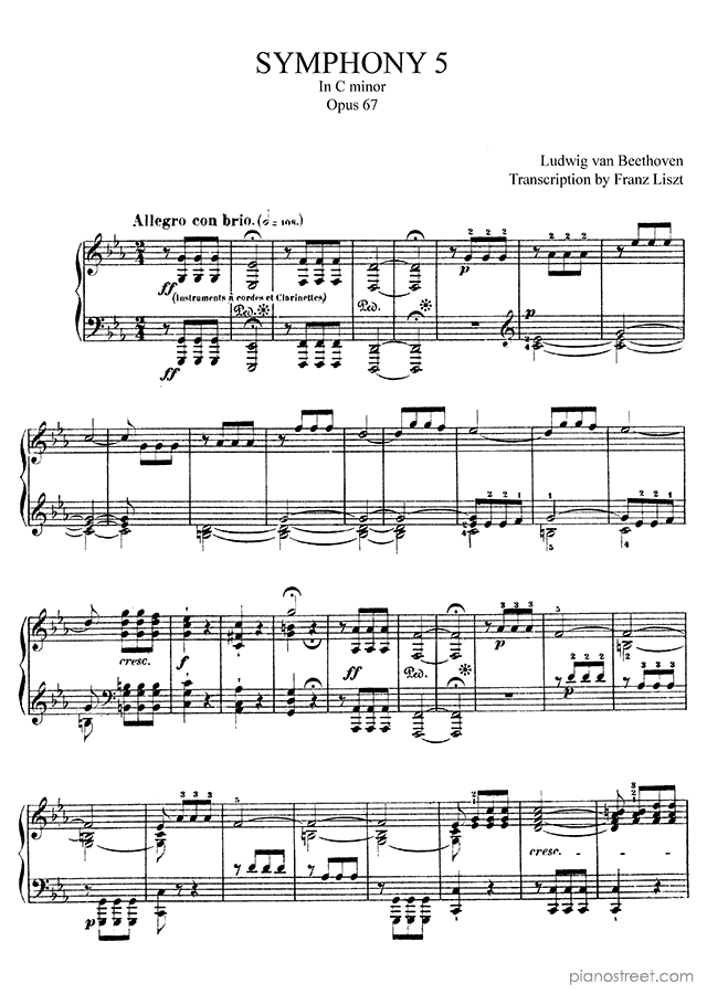 Piano sheet music and recordings. This piece is from Beethoven Symphonies by Franz Liszt: Beethoven Symphony 5 Op. 67 in C Minor (published in 1808) . Level 8+, Period: Classical