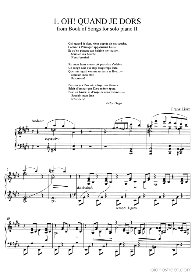 Piano sheet music and recordings. This piece is from Book of Songs for solo piano II by Franz Liszt: Oh! Quand je dors S. 536 in E Major (published in 1847) . Level 8, Period: Early Romantic