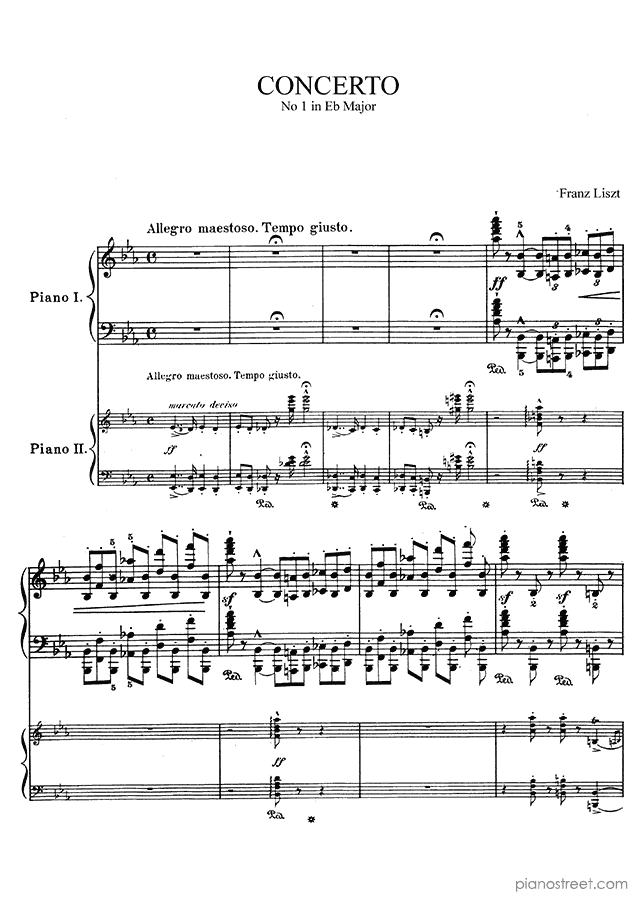 Franz Liszt, one of the prominent composers active in the Early Romantic era, has written this piece titled Piano Concerto 1 No. 1 in E-flat Major from Concertos. The composition is categorized as "Concerto" in Piano Street's sheet music library and the level of difficulty is 8+.