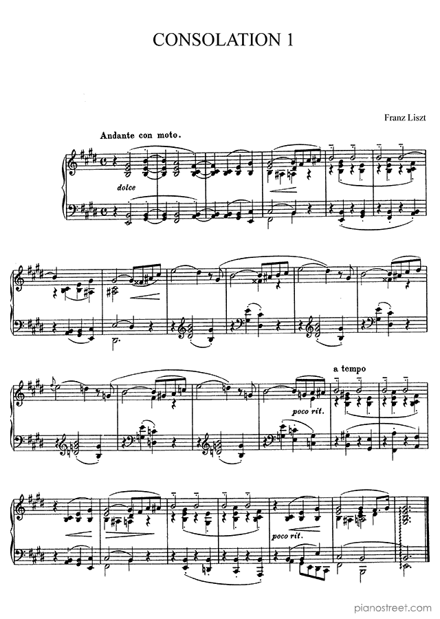 Piano sheet music and recordings. This piece is from Consolations by Franz Liszt: Consolation No. 1 in E Major (published in 1850) . Level 6, Period: Early Romantic