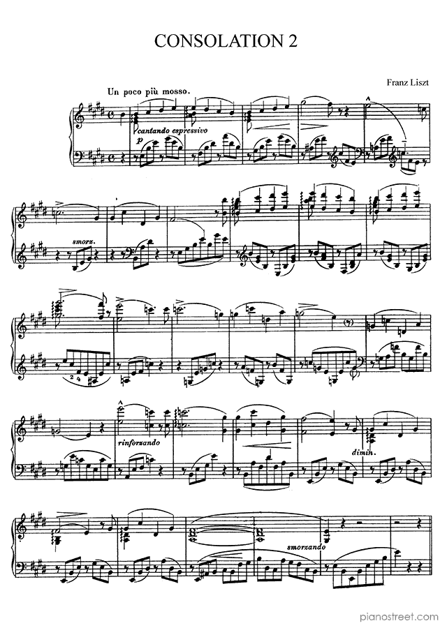 Franz Liszt: Consolation No. 2 in E Major from Consolations - piano sheet music to print instantly. This piece is level 8 and was composed during the Early Romantic period.