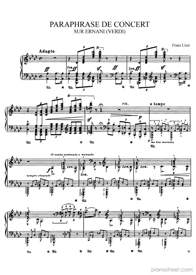 Piano sheet music and recordings. This piece is from Fantasies and paraphrases by Franz Liszt: Paraphrase de concert sur Ernani S. 432 in F Major (published in 1859) . Level 8+, Period: Early Romantic