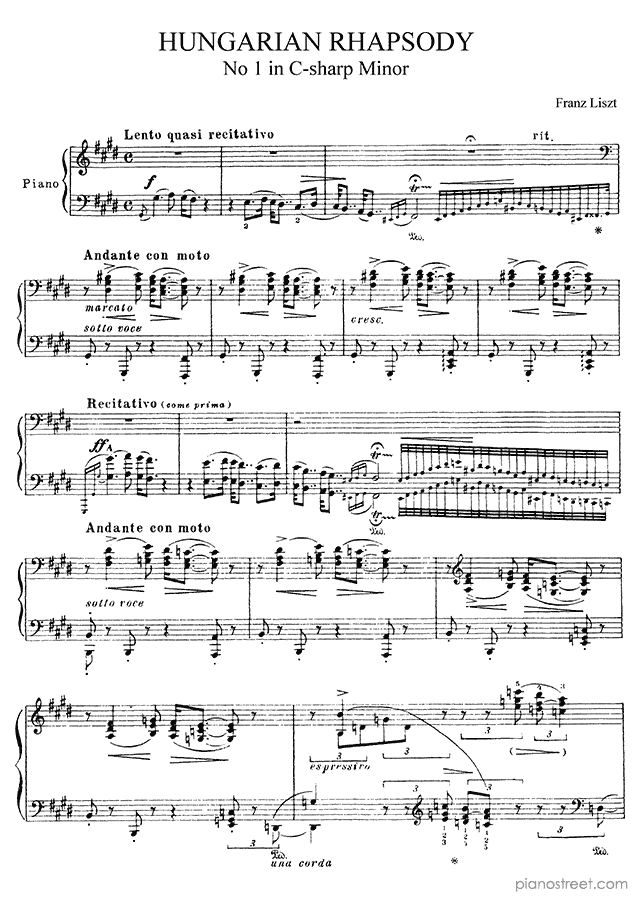 Hungarian Rhapsody in C-sharp Minor - No. 1 is a piano piece by the early romantic composer Franz Liszt who lived between the years 1811 and 1886.
