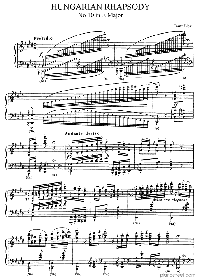 Hungarian Rhapsody in E Major No. 10 by Franz Liszt. Sheet music and recordings of thousands of piano pieces by Franz Liszt and many other famous composers to view in your digital device, print out or listen to.