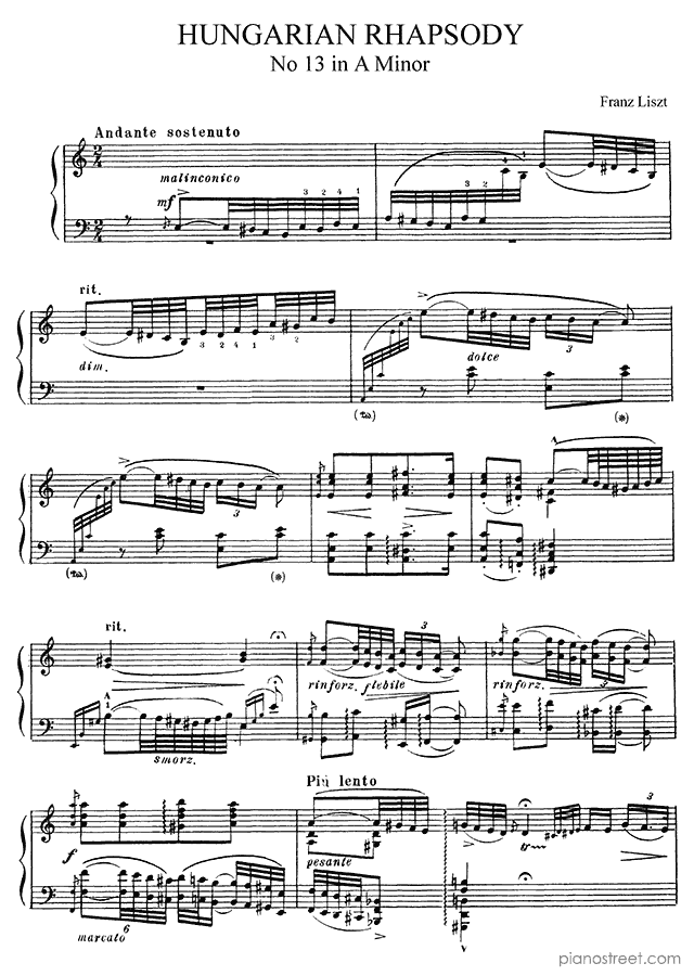 DOWNLOAD Hungarian Rhapsody in A Minor No. 13 by Franz Liszt (published in 1853) . High quality classical piano scores from the Piano Street sheet music library.