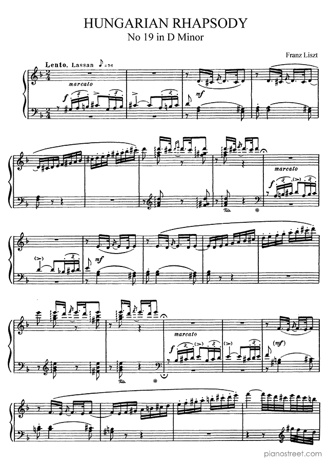Liszt: Hungarian Rhapsody No. 19 in D Minor (published in 1886) . DOWNLOAD piano sheet music from Piano Street digital sheet music library.