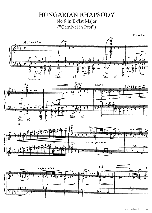 Liszt: Hungarian Rhapsody Carnival in Pest No. 9 in E-flat Major (published in 1853) . DOWNLOAD piano sheet music from Piano Street digital sheet music library.