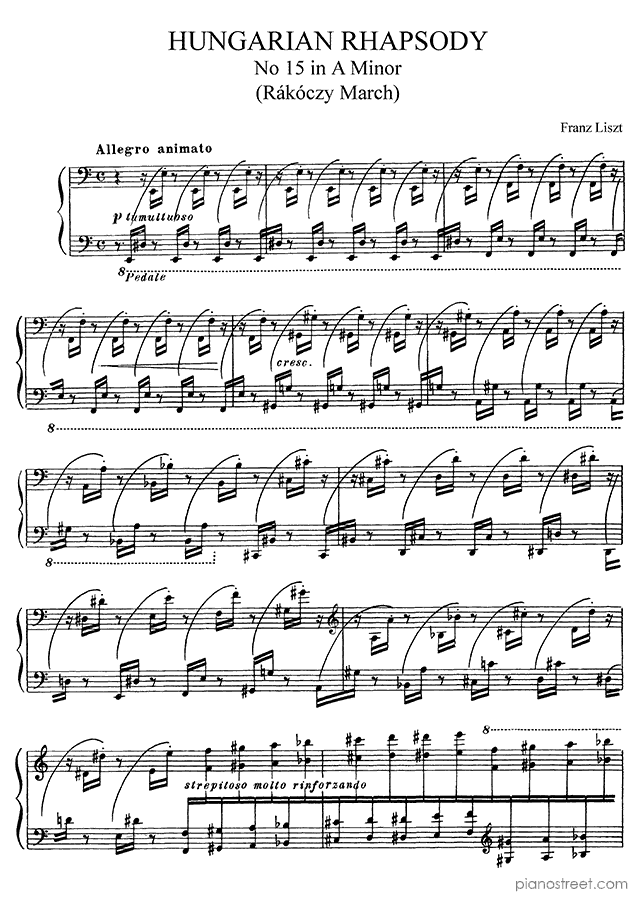 Hungarian Rhapsody (Rákoczy March) No. 15 in A Minor, a composition by the early romantic composer Franz Liszt who was born in 1811 and died in 1886. The piano score of this piece was first published in 1871 and is part of Liszt's Hungarian Rhapsodies.