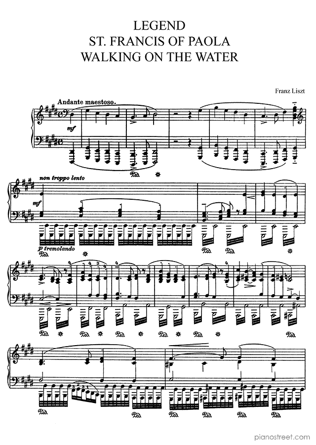 Downloadable piano sheet music from Legends by Franz Liszt to print: St. Francis of Paola Walking on the Water in E Major (published in 1863)