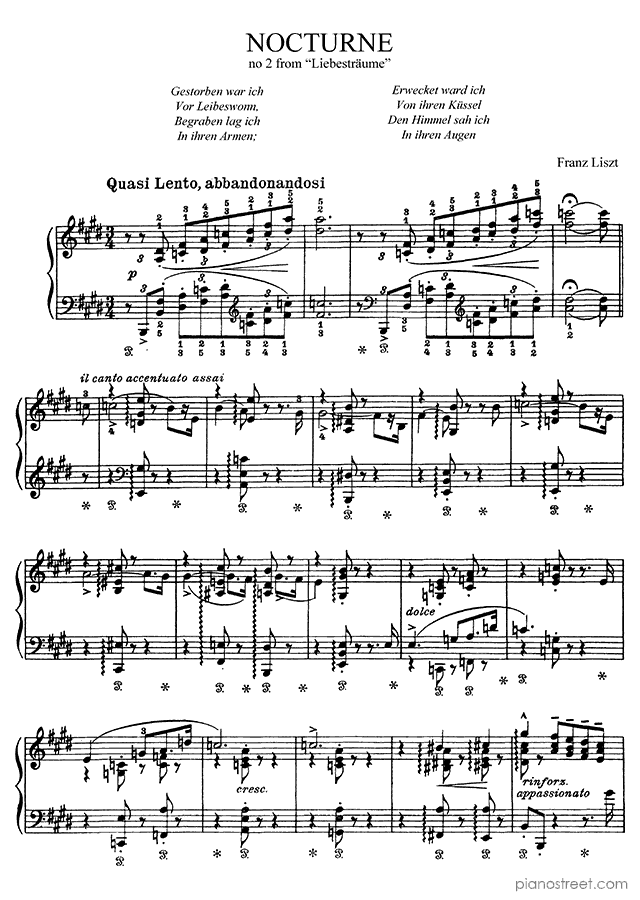 Liszt: Liebestraum - Nocturne No. 2 in E Major (published in 1850) . DOWNLOAD piano sheet music from Piano Street digital sheet music library.
