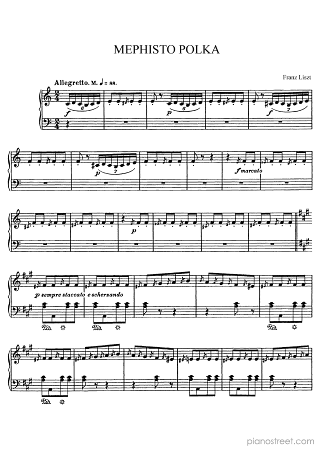 Franz Liszt: Mephisto polka S. 217 in F-sharp Minor - piano sheet music to print instantly. This piece is level 8+ and was composed during the Early Romantic period.