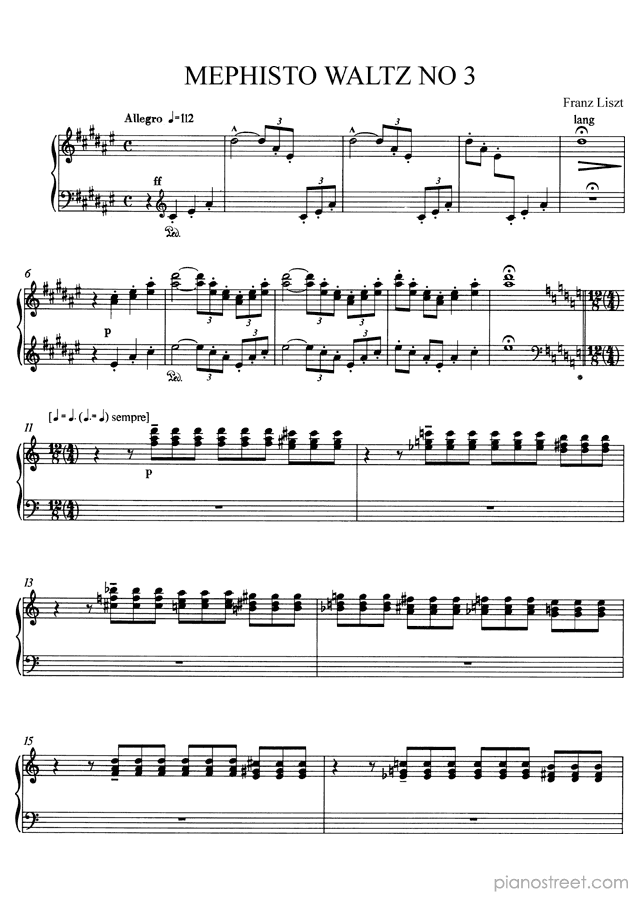 Mephisto Waltz No 3 in D-sharp Minor S. 216 by Franz Liszt. Sheet music and recordings of thousands of piano pieces by Franz Liszt and many other famous composers to view in your digital device, print out or listen to.