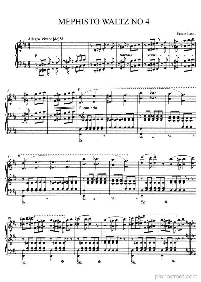 Mephisto Waltz No 4 in D Major - S. 696 is a piano piece by the early romantic composer Franz Liszt who lived between the years 1811 and 1886.