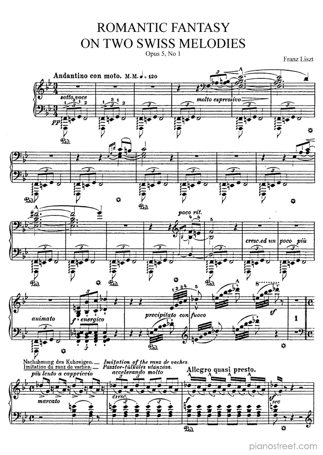 DOWNLOAD Romantic Fantasy on Two Swiss Melodies in B-flat Major S. 157 by Franz Liszt (published in 1836) . High quality classical piano scores from the Piano Street sheet music library.
