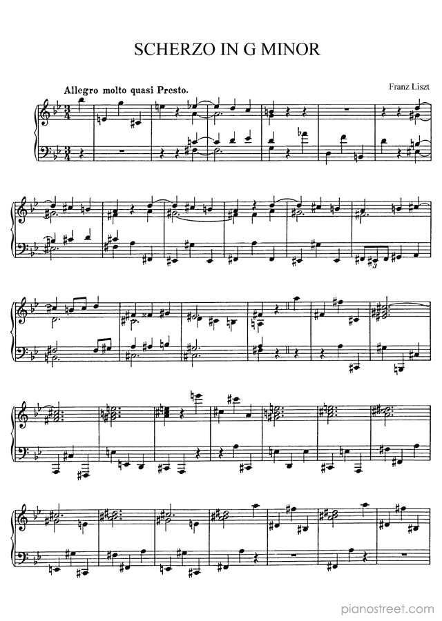 Piano sheet music and recordings. This piece is by Franz Liszt: Scherzo in g minor S. 153 in G Minor (published in 1827) . Level 8+, Period: Early Romantic