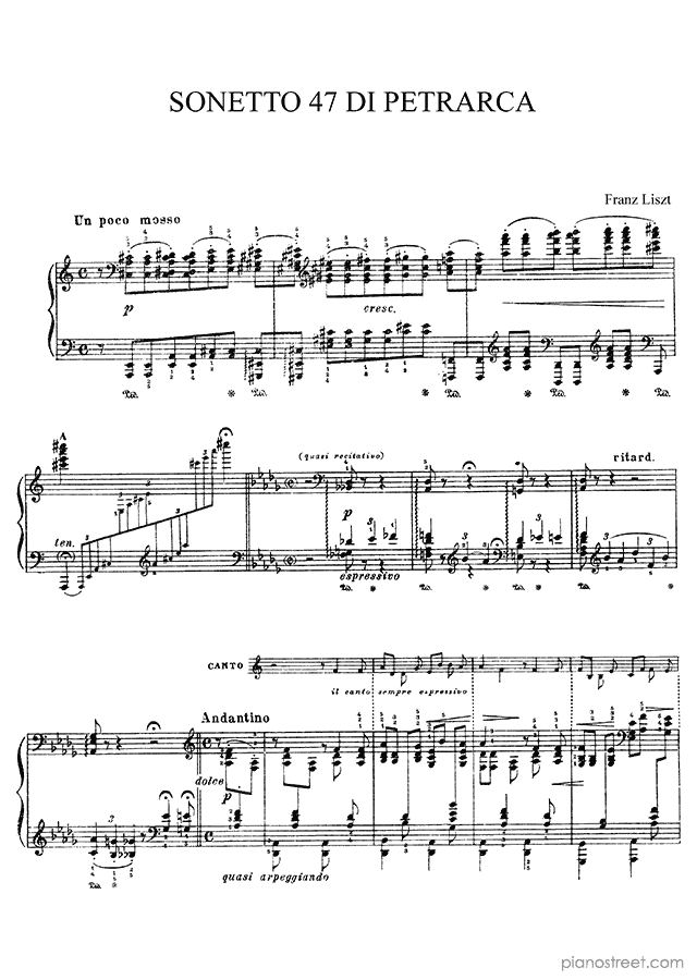 Sonetto 47 by Franz Liszt. Sheet music and recordings of thousands of piano pieces by Franz Liszt and many other famous composers to view in your digital device, print out or listen to.
