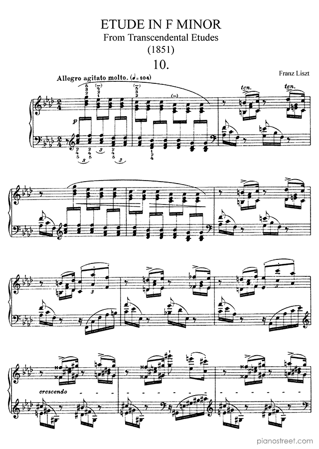 Etude in F Minor No. 10 in F Minor, by the early romantic composer Franz Liszt. This piano piece was initially published in the year 1851 and is included in Transcendental Etudes by Liszt.