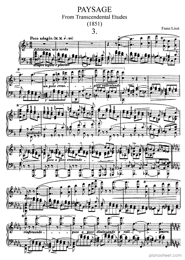 Paysage in F Major No. 3 by Franz Liszt. Sheet music and recordings of thousands of piano pieces by Franz Liszt and many other famous composers to view in your digital device, print out or listen to.