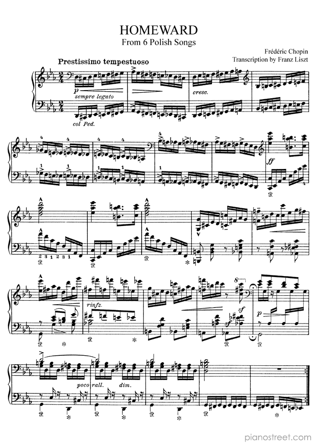 Franz Liszt: Chopin: Homeward S. 480 No. 6 in C Minor from Transcriptions of other composers' works - piano sheet music to print instantly. This piece is level 8+ and was composed during the Early Romantic period.