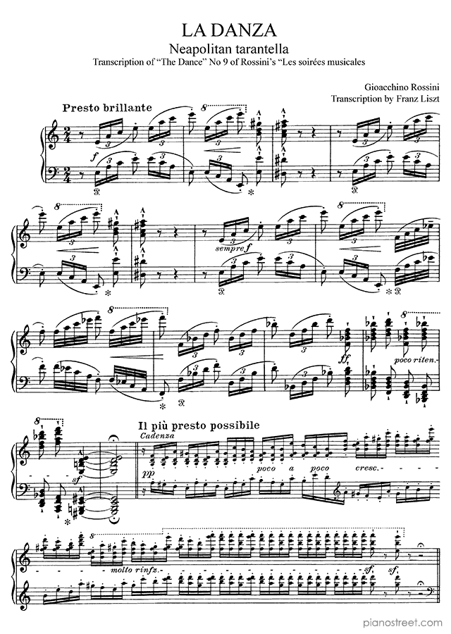 Rossini: La Danza, Neapolitan Tarantella in A Minor, a composition by the early romantic composer Franz Liszt. The piano score of this piece was first published in 1837 and is part of Transcriptions by Liszt.