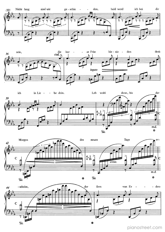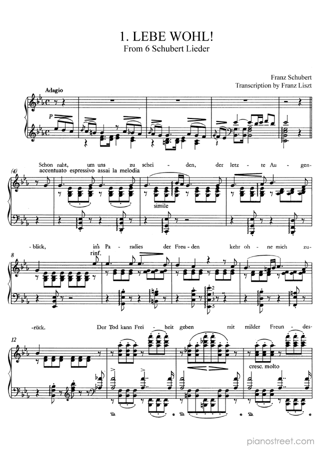 Franz Liszt: Schubert: Lebe wohl! S. 563 No. 1 in E-flat Major from Transcriptions of other composers' works - piano sheet music to print instantly. This piece is level 8+ and was composed during the Early Romantic period.