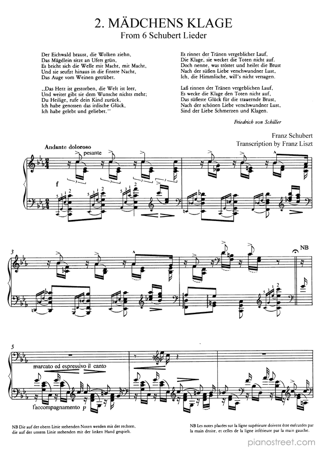DOWNLOAD: Franz Liszt - Schubert: Mädchens Klage S. 563 No. 2 in C Minor ( from Transcriptions of other composers' works by Liszt). Piano sheet music to print immediately or to view in mobile devices.