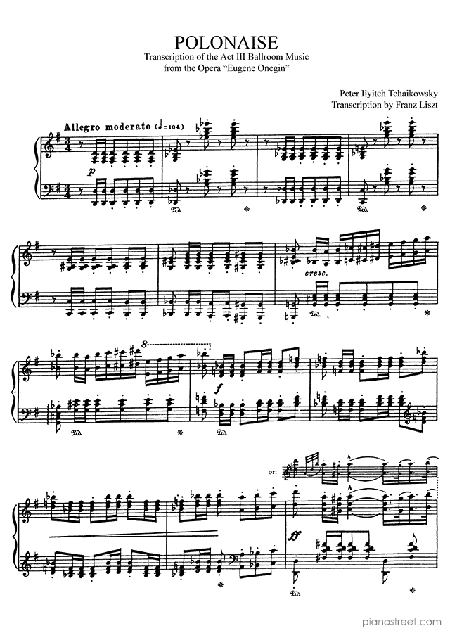 Tchaikowsky: Polonaise by Franz Liszt. Sheet music and recordings of thousands of piano pieces by Franz Liszt and many other famous composers to view in your digital device, print out or listen to.