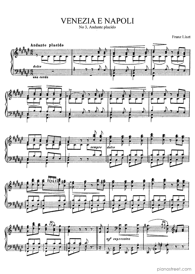 Andante placido No. 3, a composition by the early romantic composer Franz Liszt who was born in 1811 and died in 1886. The piano score of this piece was first published in 1840 and is part of Liszt's Venezia e Napoli.