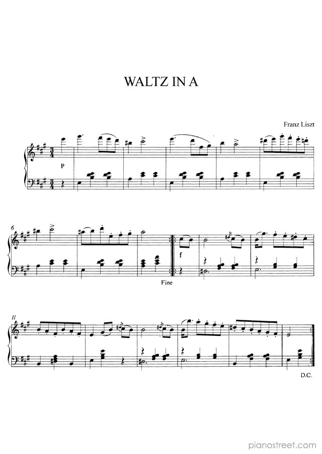 Waltz in A in A Major S. 208 by Franz Liszt. Sheet music and recordings of thousands of piano pieces by Franz Liszt and many other famous composers to view in your digital device, print out or listen to.