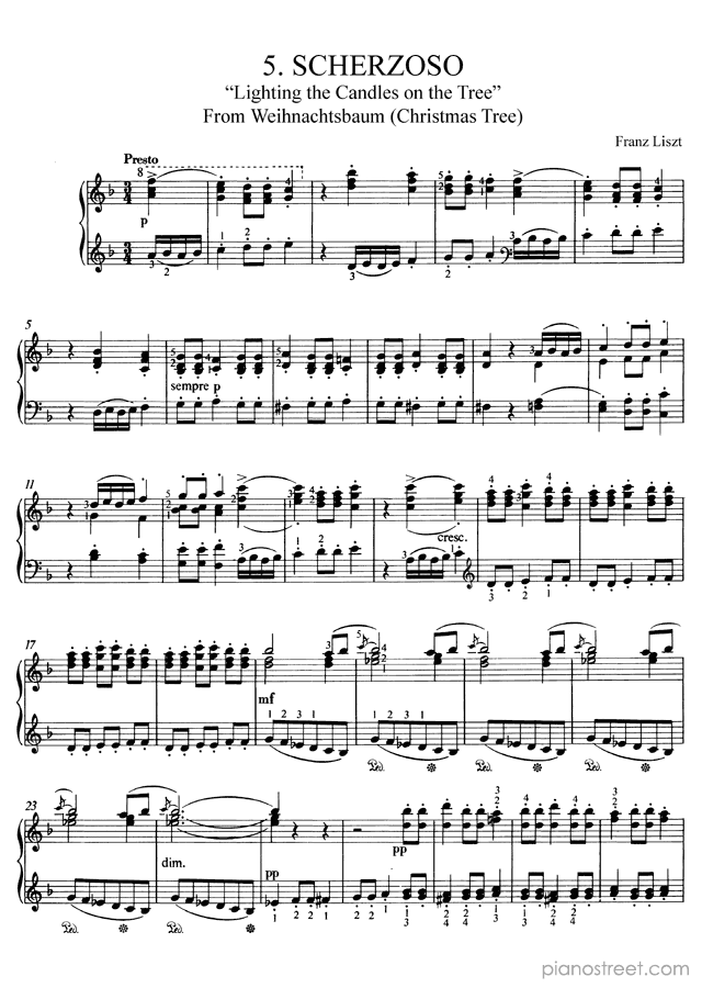 Early Romantic piano sheet music by Franz Liszt to download and print instantly: Scherzoso: Lighting the Candles on the Tree S. 186 No. 5 in the key of . Level 8+, compositional type: Suite (published in 1876)
