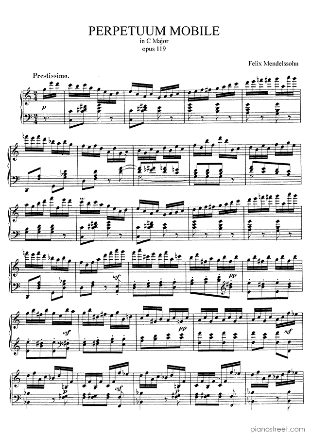 Piano sheet music downloads and recordings. This piece is by Felix Mendelssohn: Perpetuum Mobile Op. 119 in C Major (published in 1837) . Level 8+, Period: Early Romantic