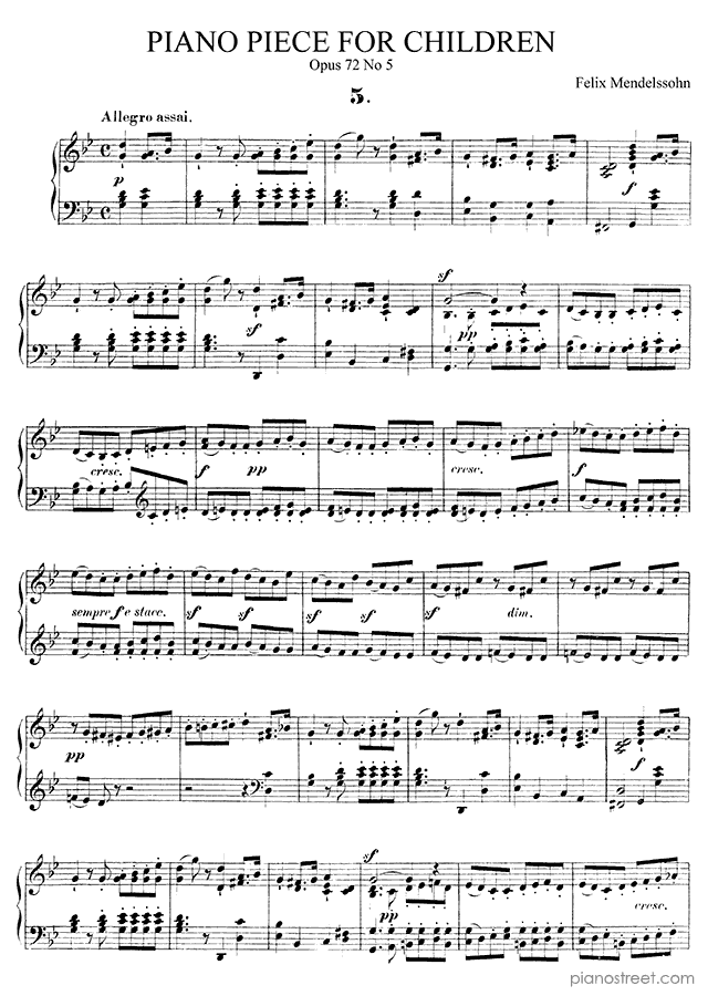 Classical piano sheet music by Mendelssohn to download: Allegro assai Op. 72 No. 5 in the key of This piece has difficulty level 5 in the category Piece