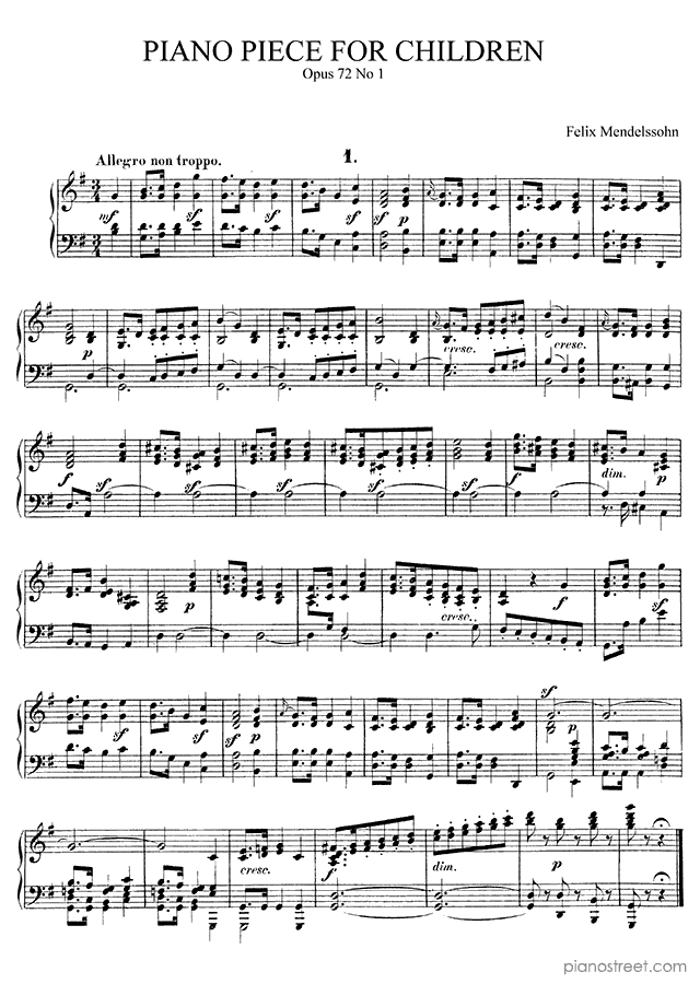 Allegro no troppo Op. 72 No. 1 in G Major (published in 1842) from Six Pieces for Children by Felix Mendelssohn - piano sheet music to download and print instantly.