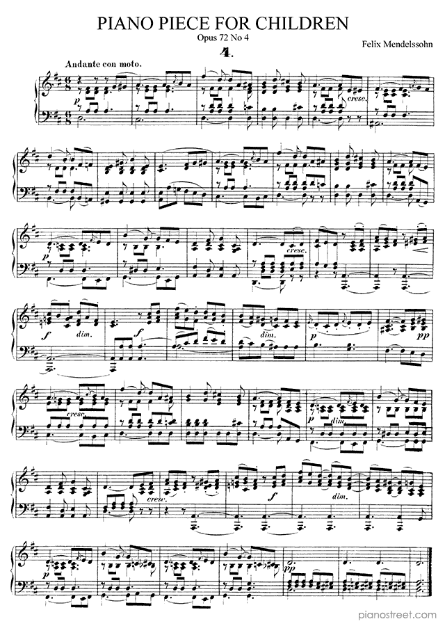 Andante con moto Op. 72 No. 4 in D Major, a composition by the early romantic composer Felix Mendelssohn. The piano score of this piece was first published in 1842 and is part of Six Pieces for Children by Mendelssohn.