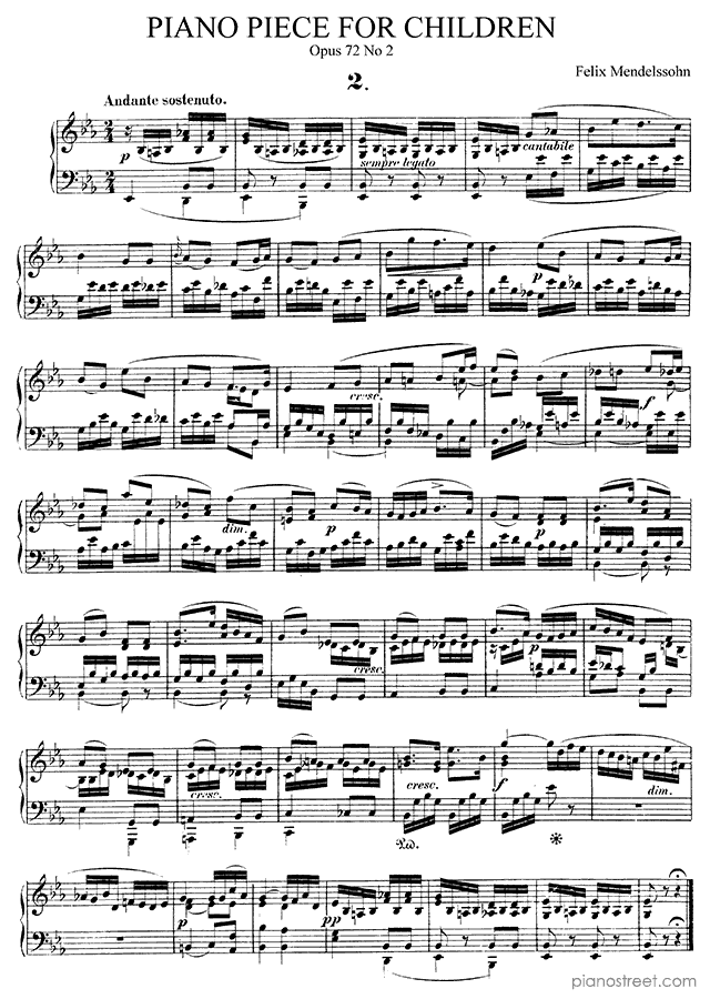 DOWNLOAD: Felix Mendelssohn - Andante sostenuto Op. 72 No. 2 in E-flat Major ( from Six Pieces for Children by Mendelssohn). Piano sheet music to print immediately or to view in mobile devices.