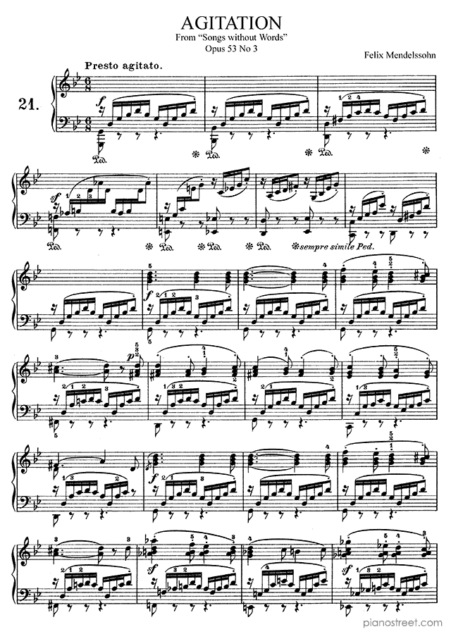 Downloadable piano sheet music from Songs Without Words by Felix Mendelssohn to print: Agitation Op. 53 No. 3 in G Minor (published in 1841)