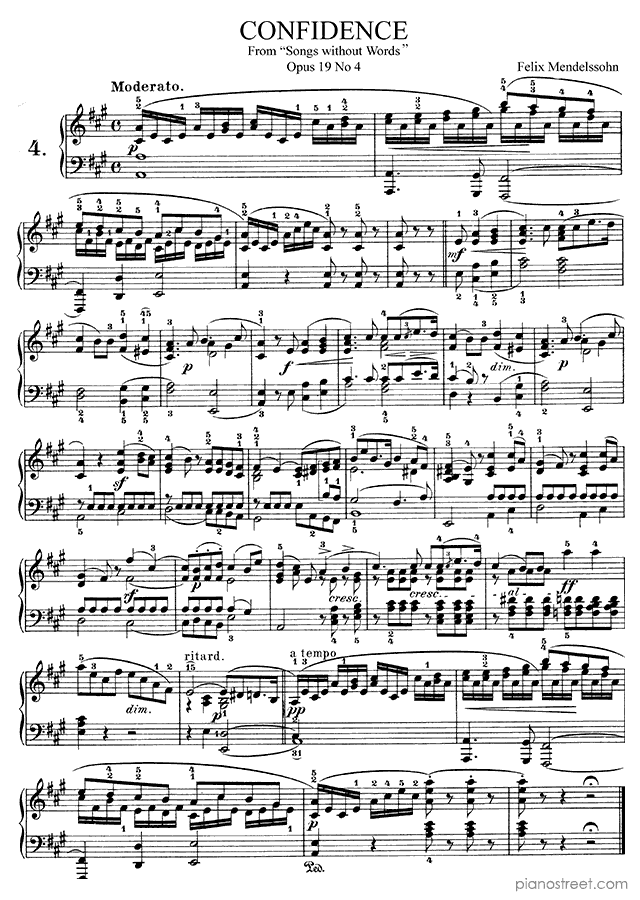 Piano sheet music and recordings. This piece is from Songs Without Words by Felix Mendelssohn: Confidence Op. 19 No. 4 in A Major (published in 1834) . Level 6, Period: Early Romantic