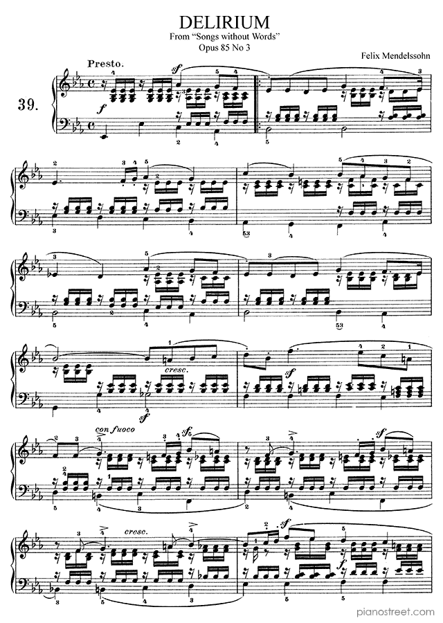 Delirium Op. 85 No. 3 in E Major (published in 1845) from Songs Without Words by Felix Mendelssohn - piano sheet music to download and print instantly.