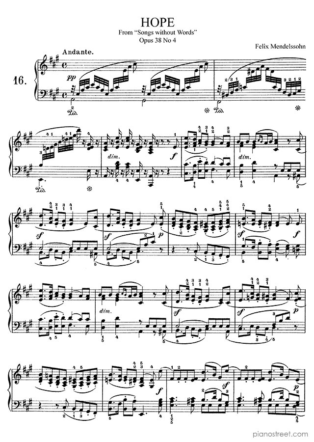 Mendelssohn: Hope Op. 38 No. 4 in A Major (published in 1837) . DOWNLOAD piano sheet music from Piano Street digital sheet music library.
